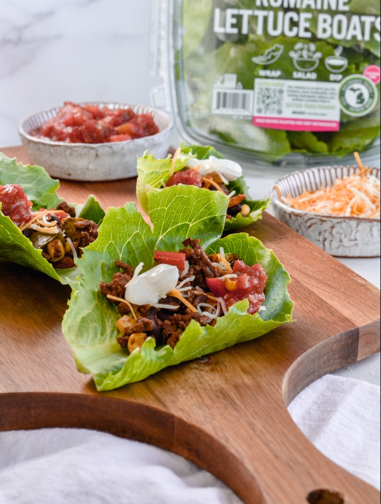 Revolution Farms Romaine Lettuce Boats are the perfect vehicle for this delicious appetizer or healthy dinner. Romaine Lettuce Boats are available at all Meijer stores!