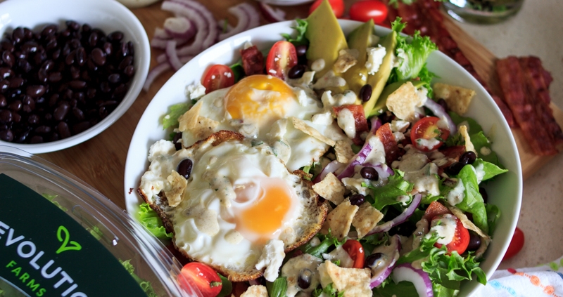 This breakfast salad features your favorite breakfast combo of eggs and bacon on a medley of our fresh, local lettuce greens, black beans, tomatoes, red onion, avocado, cotija cheese and topped with a creamy spicy verde dressing! It’s a great way to switch up your normal breakfast routine!