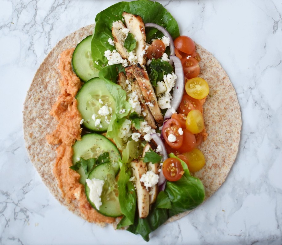 Are you ready for healthier foods? Greek Chicken Wraps are loaded with lemon herb grilled chicken, hummus, tomatoes, feta cheese, cucumbers, lettuce and red onion for a nutritious and delicious meal!